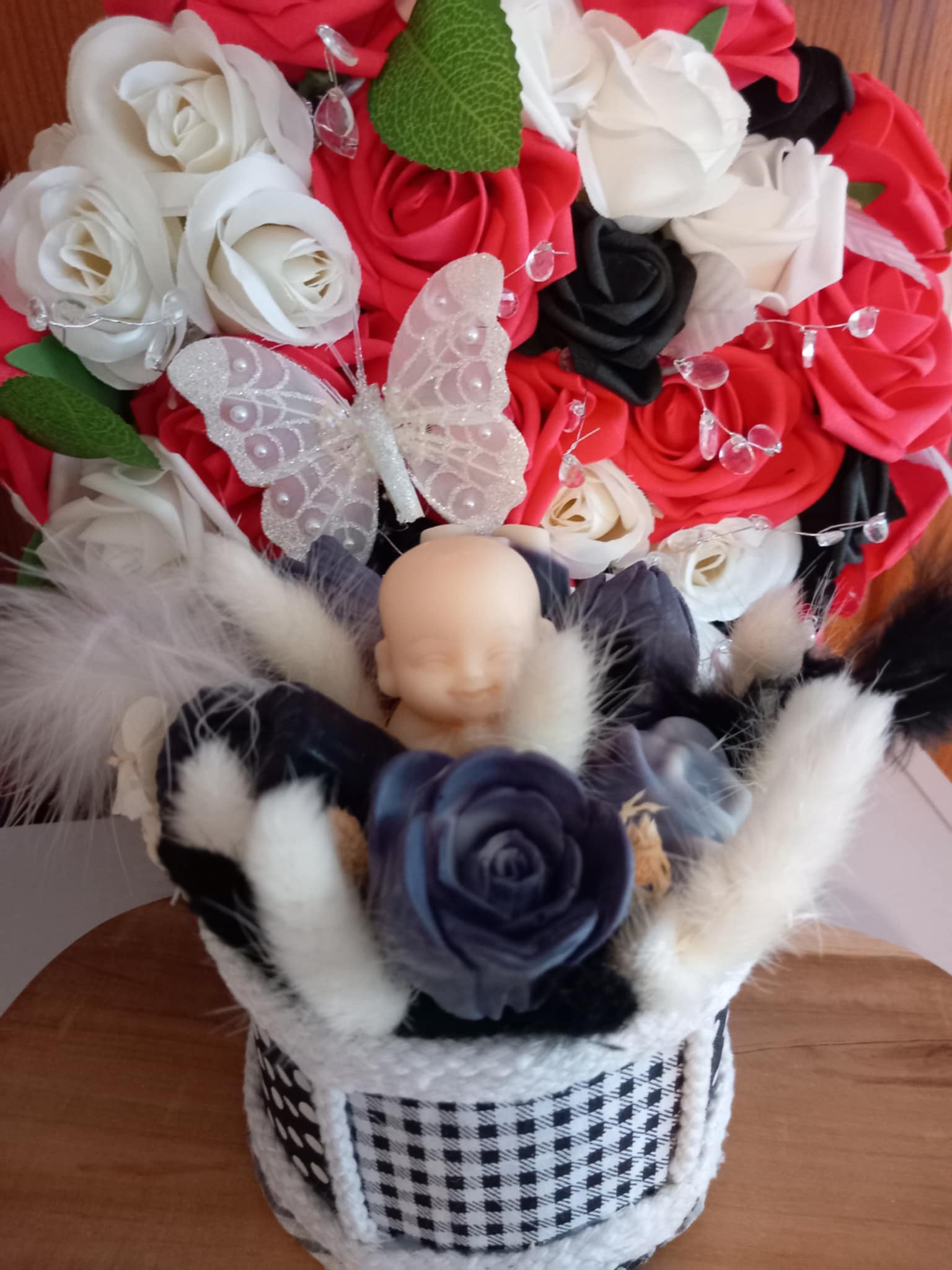 Laissez-vous charmer par ce bouquet floral en cire de soja parfumée, entièrement façonné à la main. Composé de fleurs en cire aux nuances élégantes de noir, blanc et gris, il est accompagné de plumes douces, d’éléments naturels et d’un petit sujet décoratif apportant une touche tendre et originale.